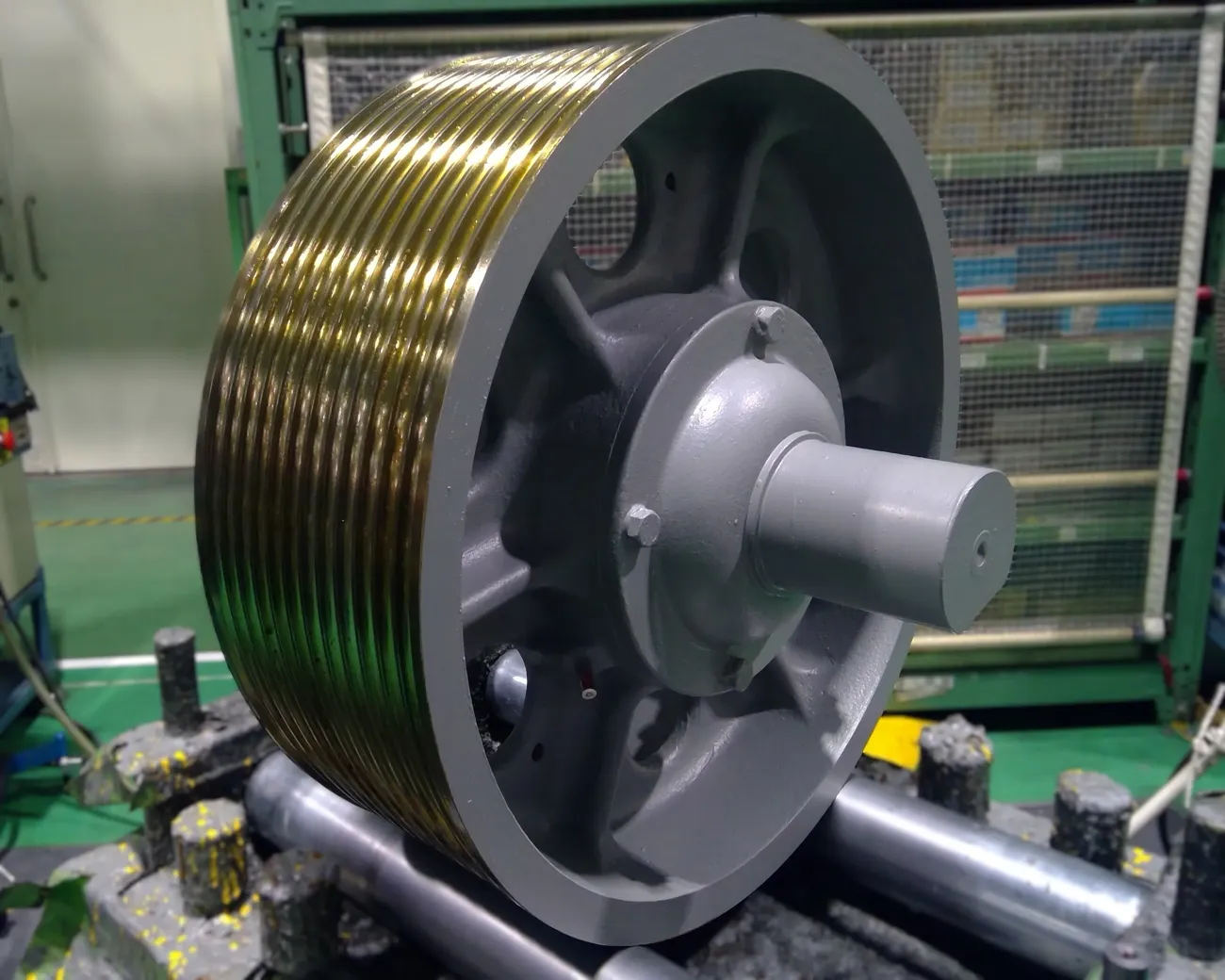 エレベーターのかご室と重り(釣り合い重り)を釣り下げるワイヤーロープをかける滑車を一貫生産しています。