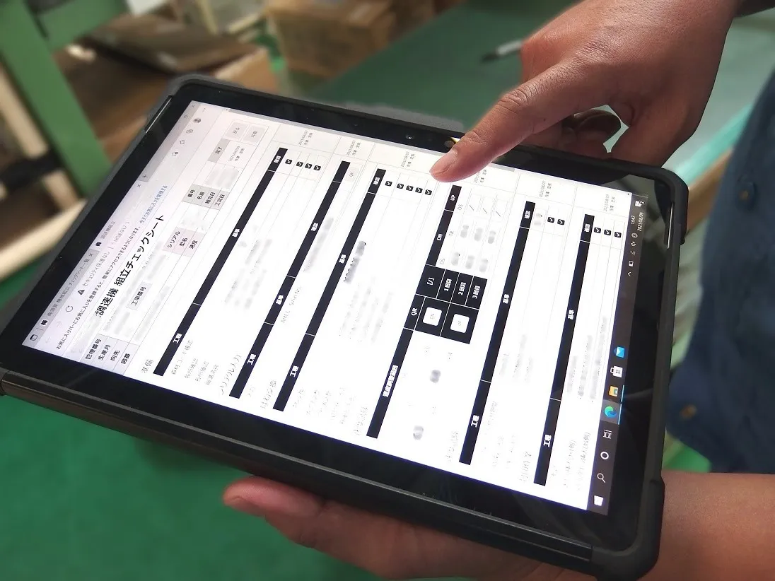 以前は現場作業者への指示や記録を目的とした組立工程の品質チェックシートを紙面で発行していました。そこで、チェック項目のデータベースの構築とタブレット端末用のGUI(グラフィカルユーザーインターフェース)の開発を実施。