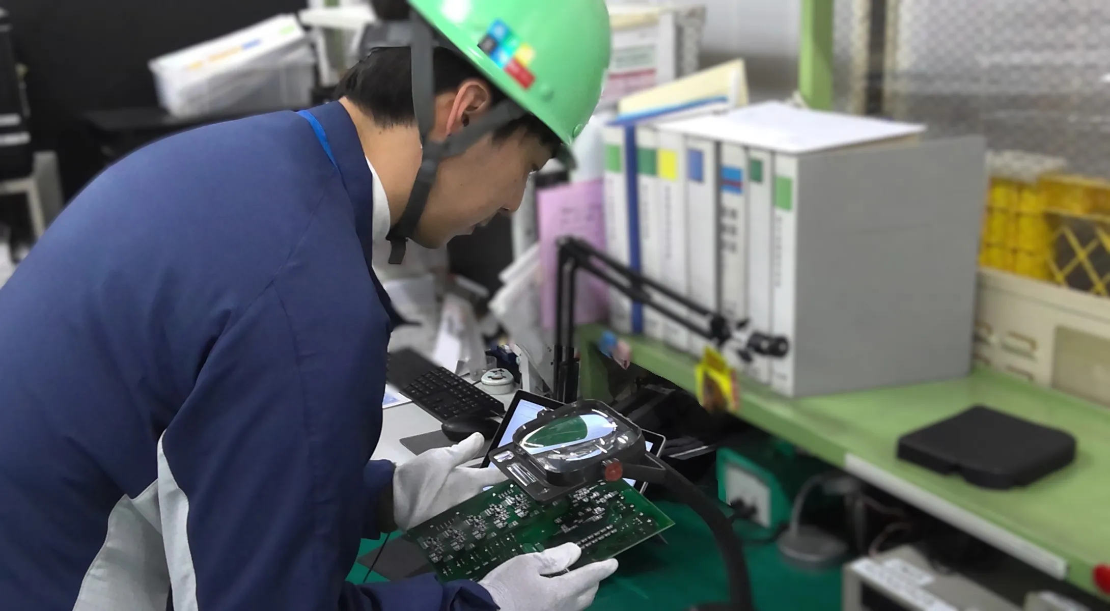 様々な検査装置・計測機器などを使用し、エレベーター・エスカレーターの保守用の電子部品、機械部品の検査を行っています。